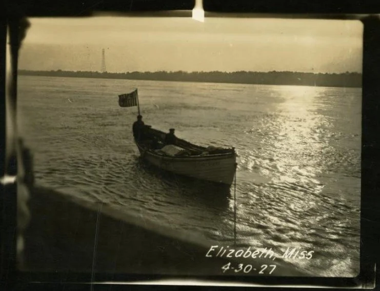 From the Mississippi Department of Archives and History 1927 Flood Photograph Collection. Shows the bottom right photo of an album page with four black-and-white photographs of flood scenes. In the foreground is a rowboat in the flood waters with two individuals in it, one at the stern and the other in the middle. The boat has a Coast Guard flag on a pole at the stern and the words "Coast Guard" are written on its side. There is a tree line in the background. Text in the bottom right reads "Elizabeth, Miss 4-30-27."