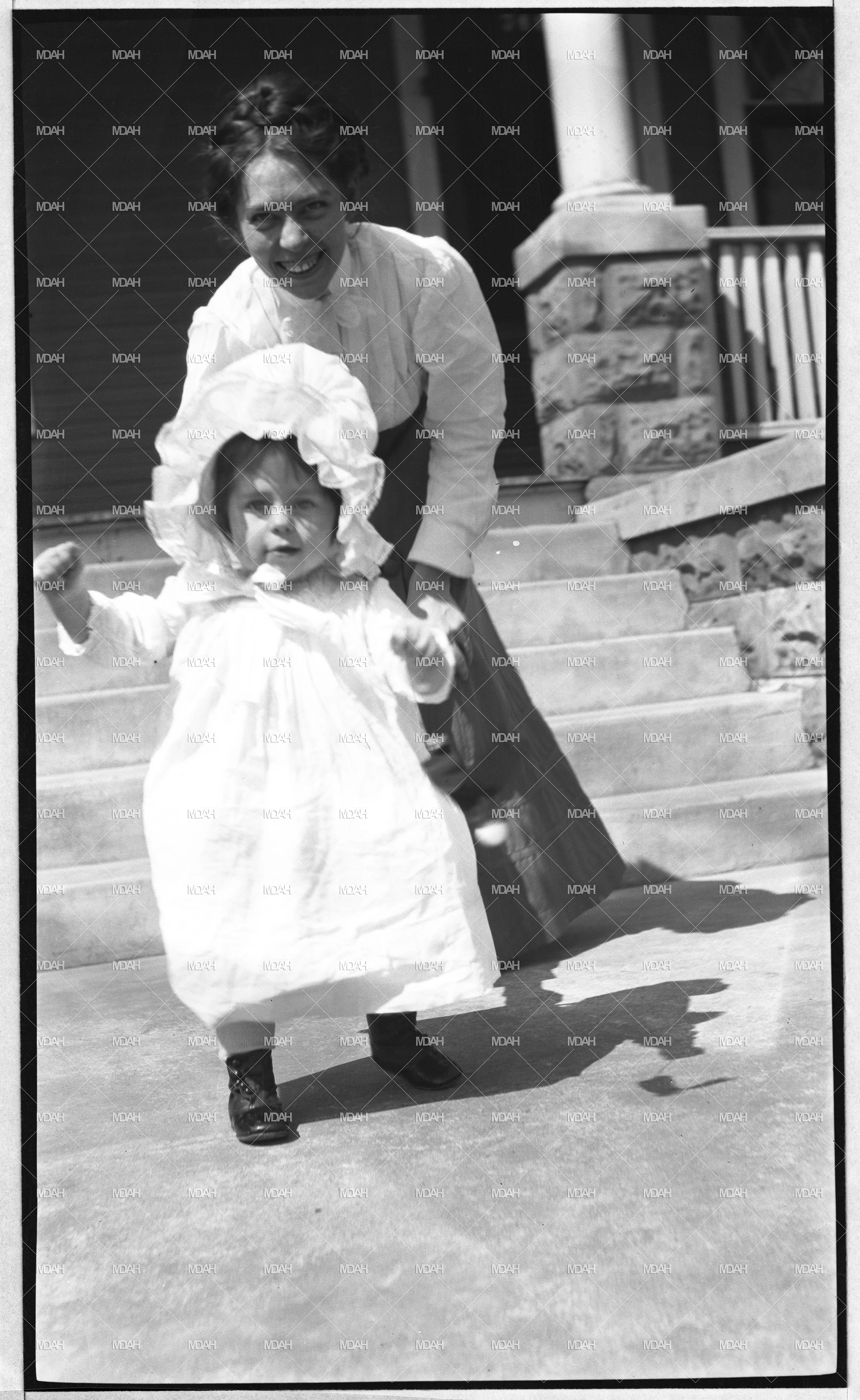 From the Eudora Welty Digital Archives Photographs Collection - MDAH. Black-and-white photograph of two figures in front of a porch and concrete steps, both are looking at the camera. An adult woman [Chestina Welty] in a light-colored blouse and dark skirt is chasing a walking toddler [Eudora Welty], who's dressed in a light-colored dress and bonnet.